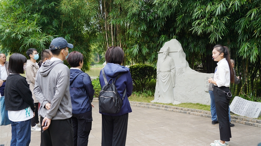 參觀的第二站是竹園,一走進(jìn)竹園,“竹未出土先有節(jié)”這句漢白玉雕刻的詩(shī)詞在郁郁蔥蔥的竹林掩映下十分醒目。園區(qū)分為“頌竹”“品竹”“聽(tīng)竹”“知竹”,完美地將“景”與風(fēng)清氣正的“廉”融合,構(gòu)成“半山半水半竹林”的雅致景色。在參觀過(guò)程中,講解員向大家訴說(shuō)著古代清官廉吏的典故,感受著先輩們剛正廉明的優(yōu)秀品質(zhì),也體會(huì)到古往今來(lái)的“廉竹精神”。