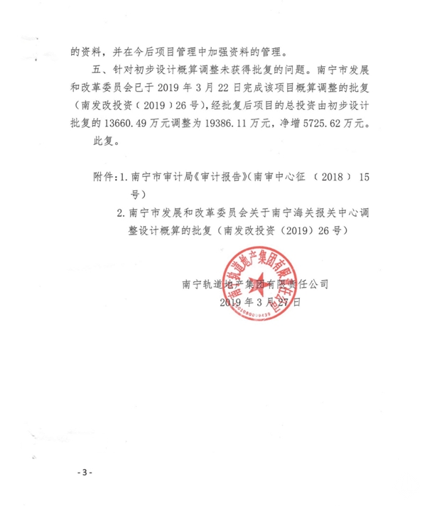 南寧軌道地產(chǎn)集團(tuán)有限責(zé)任公司關(guān)于對(duì)南寧海關(guān)報(bào)關(guān)中心工程預(yù)算執(zhí)行情況審計(jì)事宜的復(fù)函